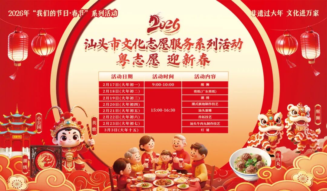 骏马迎春,潮韵飘香!由汕头市文化广电旅游体育局主办,汕头市文化馆、汕头市非物质文化遗产保护中心承办的汕头市文化志愿服务系列活动之2026年非遗贺新春活动将于春节及元宵期间举办,邀您共度地道潮味中国年!