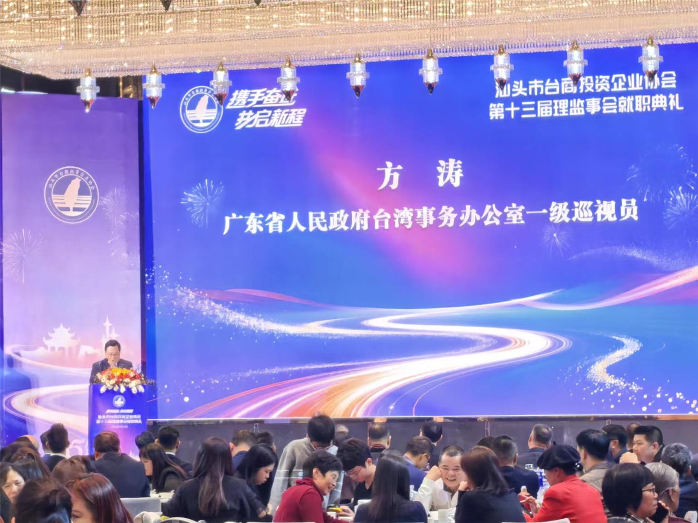 汕头与台湾隔海相望、一水相连,两地历史渊源深厚、人员交流密切、经贸往来频繁,是同根同源、守望相助的一家人。目前,落户汕头台企已达130多家、投资总额超20亿美元。此次就职典礼的举办,进一步凝聚了在汕台商力量,深化了汕台同胞情谊。汕头市台商投资企业协会将以此次换届为新起点,持续搭建交流合作平台,用心用情服务台商台胞,积极发挥桥梁纽带作用,为汕头高质量发展和汕台融合发展作出新的更大贡献。